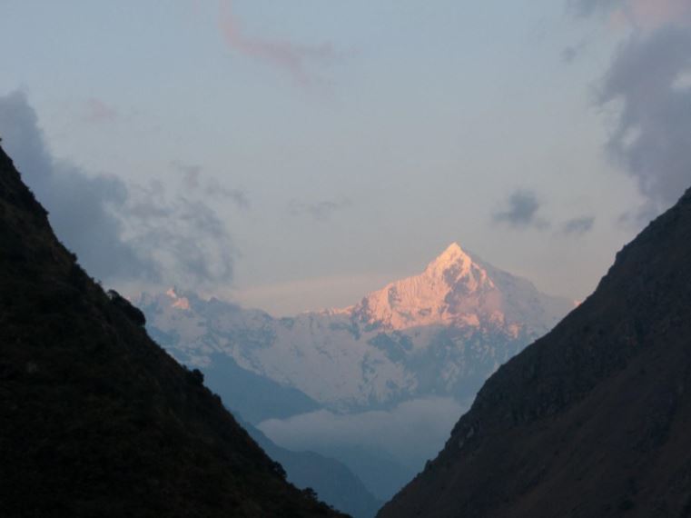We soon realised that we may not get to camp in the light and that was why Hector had sent extra helpers with us. The snow-capped mountains to our right were turning pink and Ronald told us it may take us 2 hours to get to camp. We passed through a dark tunnel and the path was by turns steps and stone path, twisting and turning around and down. There wasn’t time for many photos; our attention was concentrated completely on where to place our feet. Eventually, as darkness fell, Flo commandeered Susan’s torch and charged off with Ronald, a totally different person from this morning. I began to wonder what was really in that mug of tea!