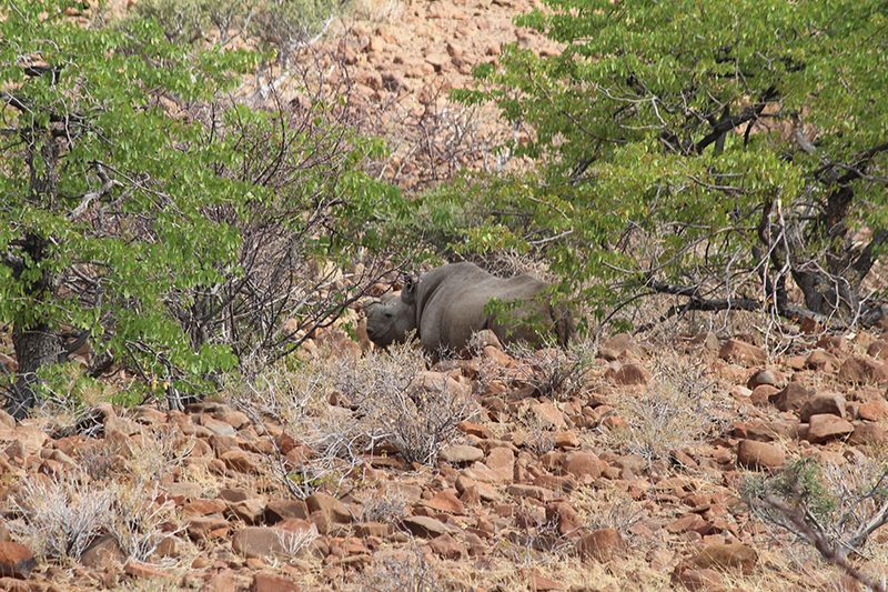 It turned out that we were in luck, and the trackers had spotted a rhino in the distance, so we got out of the vehicle and proceeded on foot in order to try and see it for ourselves. There are of course no paths, so the going is very rocky and uneven and by now the sun was up and already beating down. Despite the landscape not having a huge amount of vegetation, the rhinos are incredibly tricky to spot as they blend in with the rocks and shrubs so well. Without the help of the trackers I would have virtually no chance of seeing them. Luckily, rhinos have notoriously poor eye sight but they have an excellent sense of smell and hearing, so the key to tracking them on foot is making sure to stay downwind of them and being as quiet and still as possible.