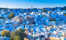 The city of Jodhpur is built around the mighty Merangarh Fort, which sits atop a steep hill staring out over the tiny houses. Jodhpur is often called the “Blue City” because of the bright hues of its painted houses. This is particularly noticeable in the north of the city, known as Brahmpuri because of the many Brahmins who live there. Following the crooked medieval streets through the sprawl of cubic blue houses, you eventually reach the old city wall, which encircles the city. Beyond the wall, the suburban landscape starts to make way for the arid expanse of the Thar Desert.