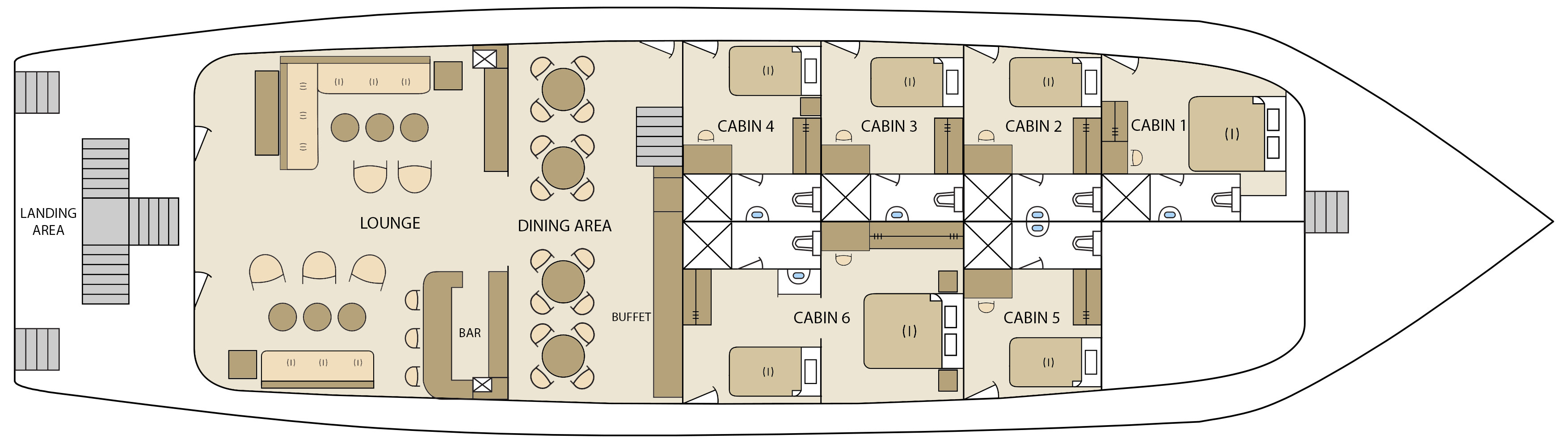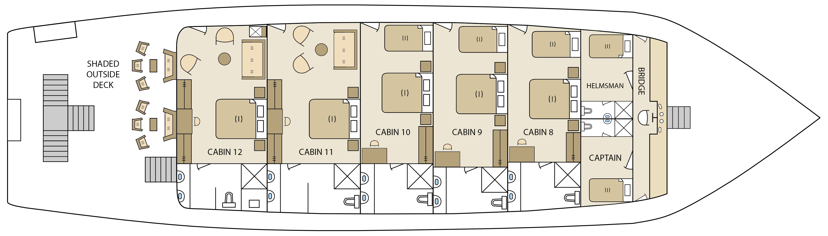 Electricity onboard is 110V and plugs are of the flat two-pin type. There are small safes in each cabin or in the captain’s cabin. There are no hairdryers in cabins on most boats.