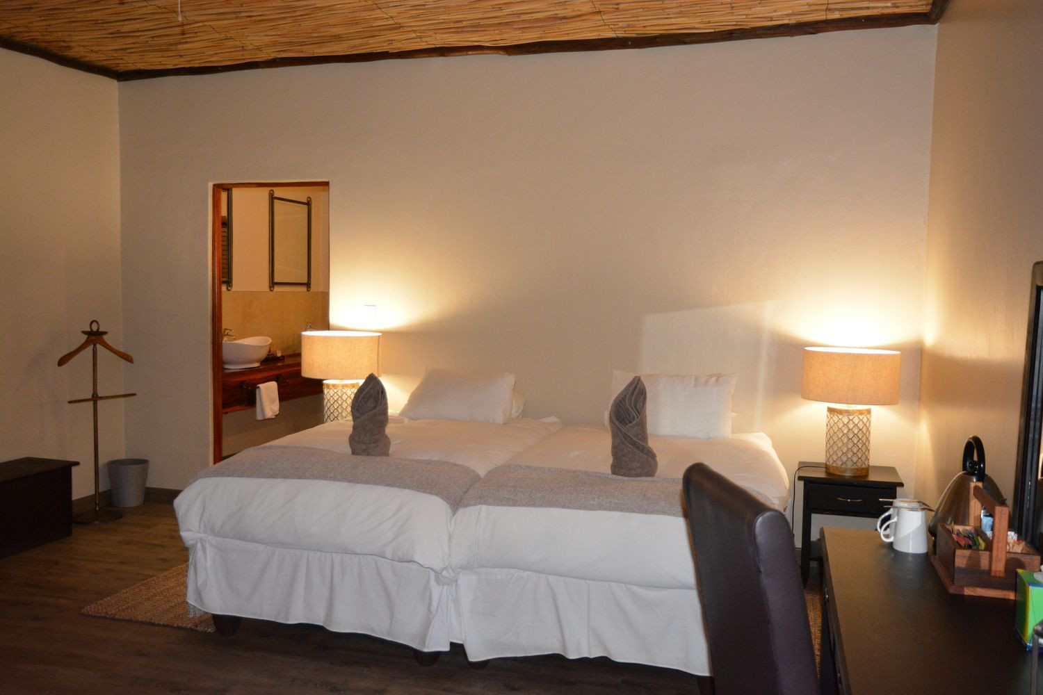 Drive to the Kalahari and take the optional Kalahari Sundowner Game DriveToday is an early start as you drive south for around 300 kilometres to the Kalahari Desert. Most of the route will be on smooth paved roads, whilst the last third of it is a gravel road, but not too bumpy. The journey is stunning, with mountainous views and plenty of photo opportunities. As you enter the Kalahari you find yourself in a vast region characterised by red sand dunes and endless grass plains interspersed with acacias. There are a few breaks en-route to stretch your legs, use the toilet and buy snacks, before arriving at the lodge in the early afternoon where you can have a late lunch. This is often the case on travelling days throughout this itinerary, and you will generally either buy snacks and then arrive at the next hotel for a late lunch, or buy lunch enroute depending on the day. Spend the rest of the afternoon relaxing at the lodge, or take the optional Kalahari Sundowner Game Drive with the chance to spot giraffe, zebra, wildebeest as well as a breathtaking sunset over the unique dune formations. In the evening, enjoy dinner at the lodge.